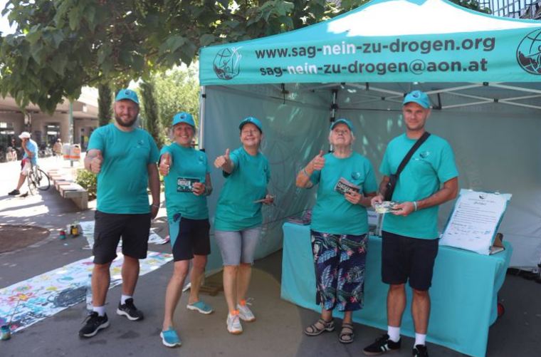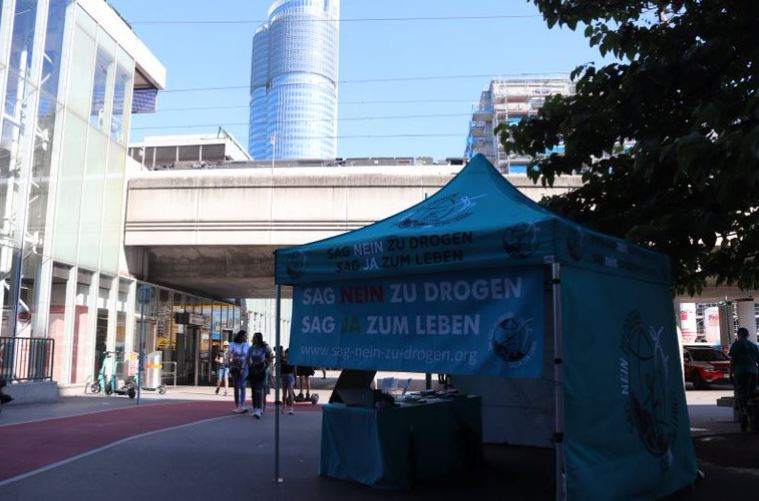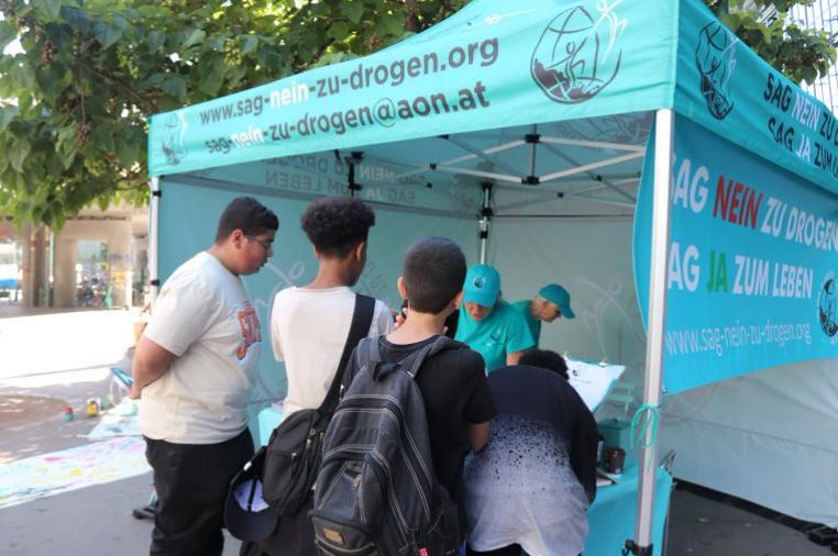 To celebrate the International Day Against Drug Abuse and Illicit Trafficking, the Say No To Drugs Team held their drug education booth ‘Sag Nein Zu Drogen’ in Vienna, at the Milllennium City, a train station and shopping center, near the Donauinsel (Danube Island). Also on this weekend was the Donauinselfest (Danube Island Festival). It’s a big festival in Vienna over the whole Danube Island with a lot of artists. Many people came to this festival by train and arrived at this station, where we were standing with the tent.