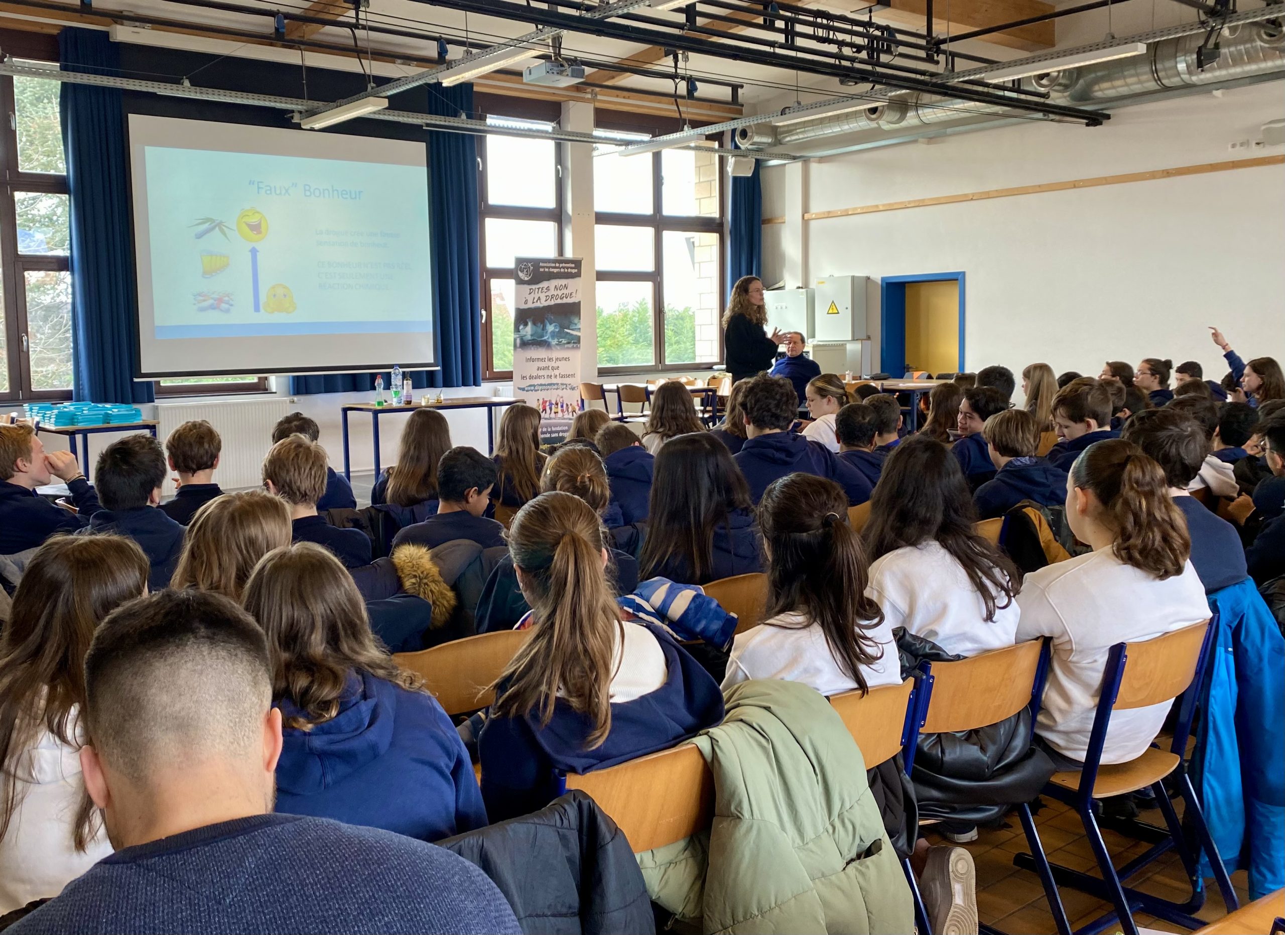 For each lecture, first the lecturer gave information on what a drug is, the physical and emotional dependencies referring to alcohol and cannabis, the entrance gates to drug use; then another lecturer gave her personal testimony on her 25 years of drug use and how she was with a strong motivation able to stop.