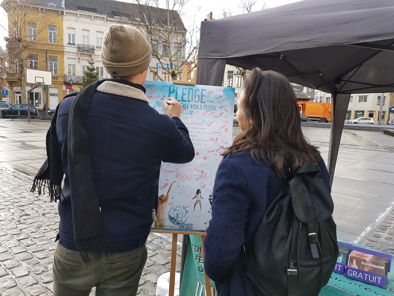 Unluckily the harbor is also one of the main entrance point for the drugs in Europe: Cocaïne, Heroïne, NSP, etc. So, on purpose, the Team set up their drug prevention booth on the strategic De Coninckplein. There, they handed-out 1200 booklets to passers-by but also visited more than 40 shopkeepers around and some 30 persons signed the Pledge. They met different ethnies all concerned by the drug subject and the Team was welcomed by different employees and educators dealing with youth, very interested by their prevention education materials. Interesting contacts were established for a follow-up.