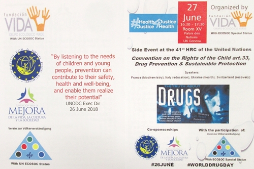 There were a full room of public attending the side event, about 50 people from different ways of life but all concerned by the human rights, including the protection of the children by the States versus drug use, which is the objective of the article 33 of the Convention on the Rights of the Child (1989).