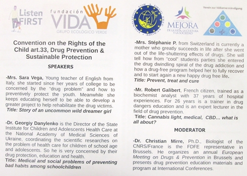 The Moderator in the introduction gave a short overview of the devastating effects created by the drugs and focused on the cannabis which is the entrance gate to the drug use for the youth. He reminded also the statements of the UNODC* Executive Director and of the former President of the INCB* very clear on the subject of recreative drug legalization and the violation of the 3 International Conventions by 2 countries worldwide !