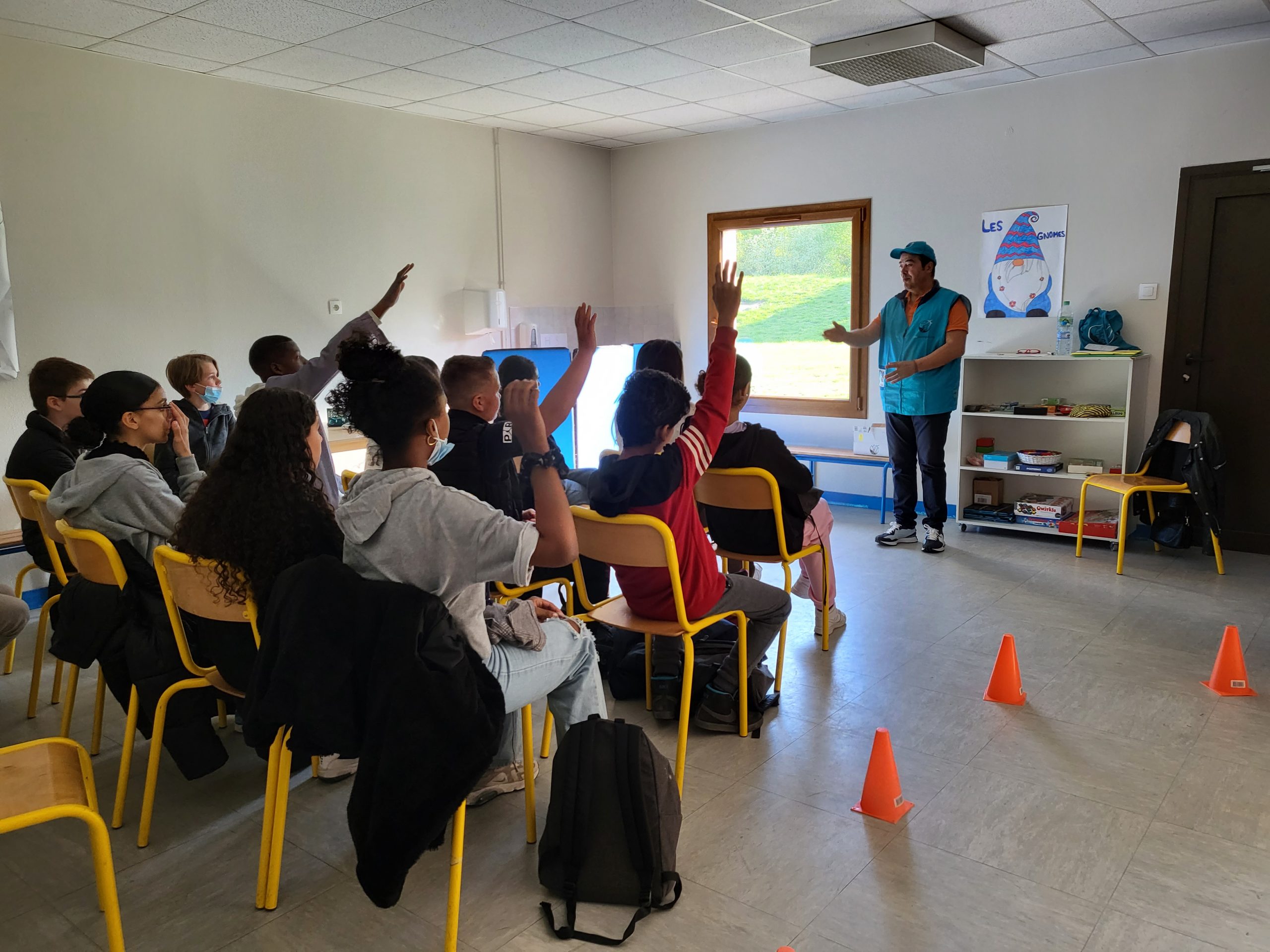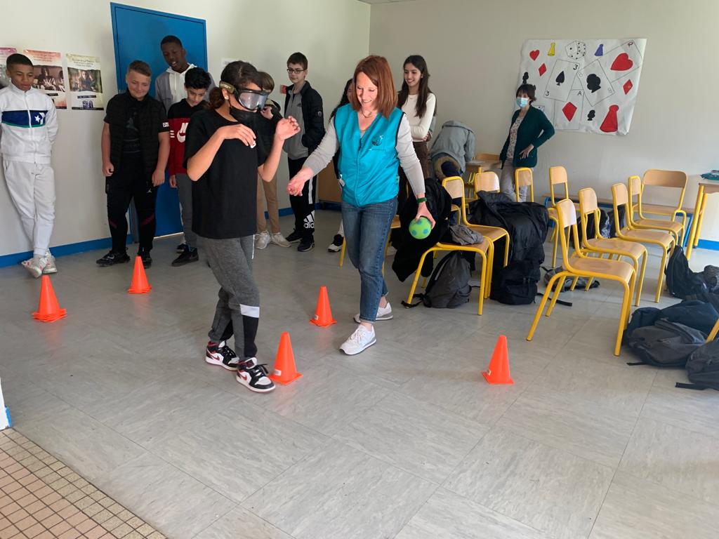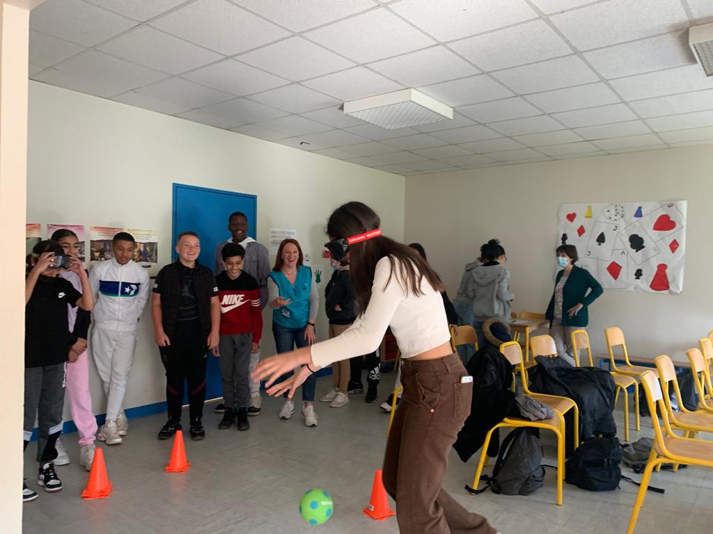 Catherine, Nadine and Patrick from 9 am to 5 pm had to deal with 11 groups of 15 students from 4 different colleges. They had half an hour to transmit to each group the key data about the reality of the harming effects of the drugs. The Team shared the time in a quarter of an hour with academic/scientific data and the next quarter was devoted to a scenario with special glasses that simulate the effect of alcohol or cannabis on the behavior.