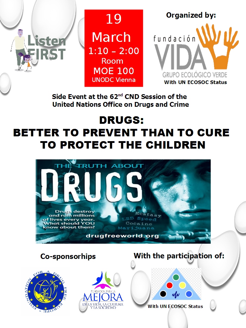 On 19 March 2019 the Foundation for a Drug Free Europe (FDFE) co-sponsored a side-event at the UNODC with Fundacion VIDA and Fundacion Mejora, both from Madrid and with the “Verein zur Förderung der Völkerverständigung” (VFV) from Vienna, during the 62nd Session of the Commission on Narcotic Drugs (14-22 March 2019). This CND Session was gathering more than 2000 participants from governments, NGOs with U.N. ECOSOC status and associations from civil society from around the world.