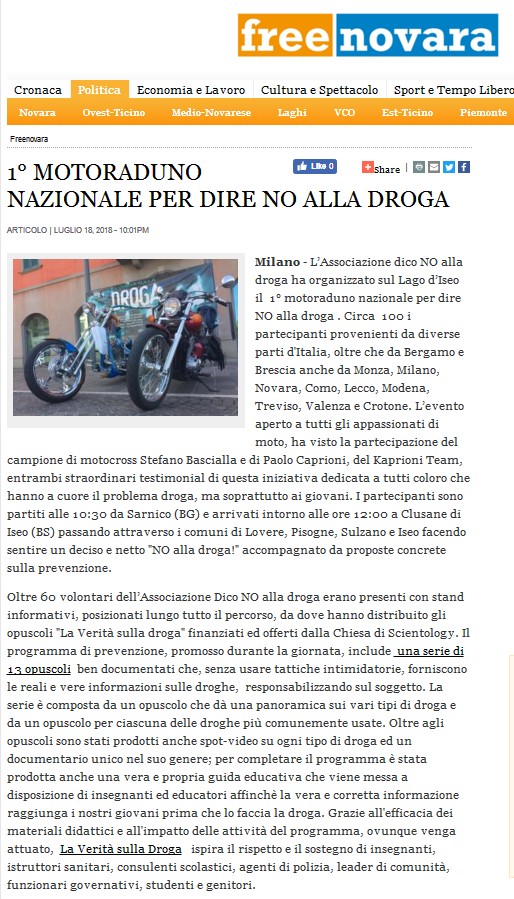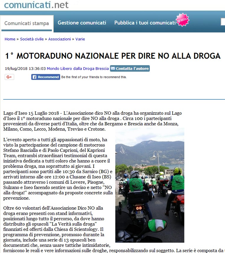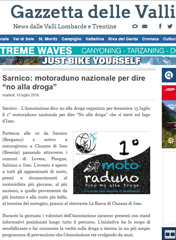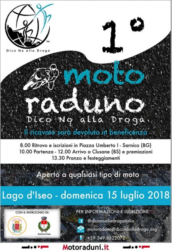 On July 15, following the International Day Against Drug Abuse and Illicit Trafficking and to raise the awareness of the youth and the public at large on the dangers of drugs, the volunteers of the Italian association Dico No alla Droga of Bergamo organized a motorcycle rally (1° Motoraduno Nazionale Dico No Alla Droga) around the beautiful and largest Iseo Lake taking its name from the city Iseo which is an enchanting historic town of medieval imprint known internationally.