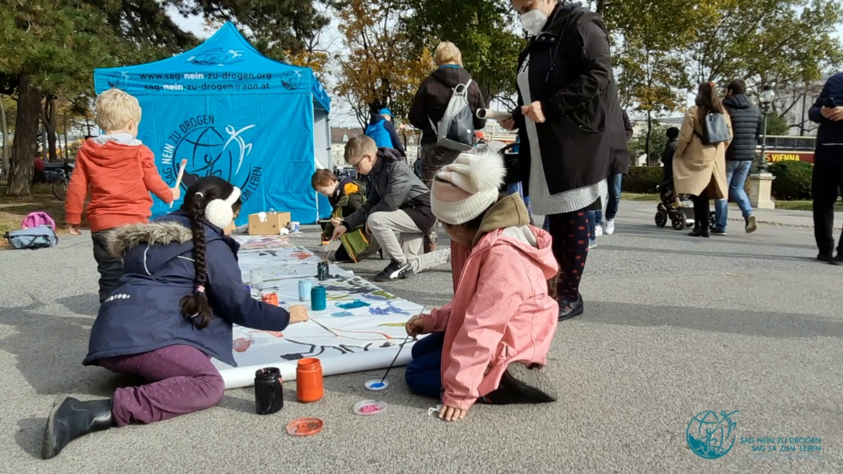 Again their free paintings on the street on the drug subject was winvolving a lot of kids, which had a lot of fun. And they are so proud, when they sign the pledge and get the whristband Zag Nein Zu Drogen.