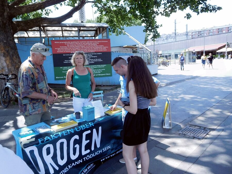 To celebrate the U.N. International day Against Drug Abuse and Illicit Trafficking, the Say No To Drugs (Sag Nein Zu Drogen) team of Vienna set up their booth in the Wien Praterstern which is a major square located in the Leopoldstadt area of Vienna. In proximity you will find also the famous column to Admiral Wilhelm von Tegetthoff, the Praterstern railway station and the U-Bahn U1 and U2.